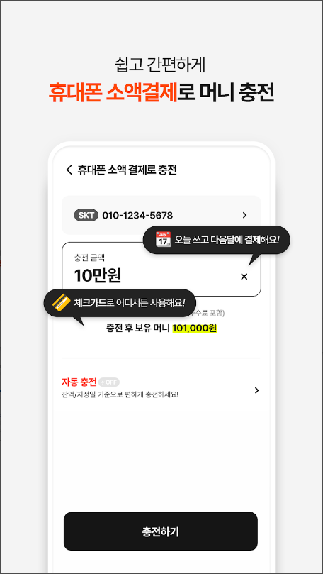 • 휴대폰 번호만 있으면 최대 20만 원 충전